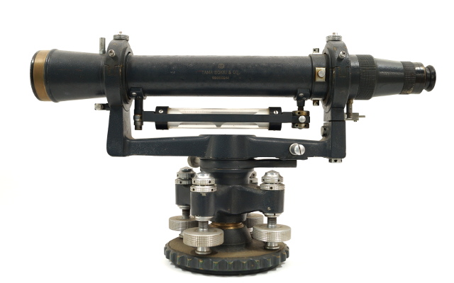 Leve(レベル)。水管を用いて点間の高低差や比高を直接測る器具です。水準器ともいいます。